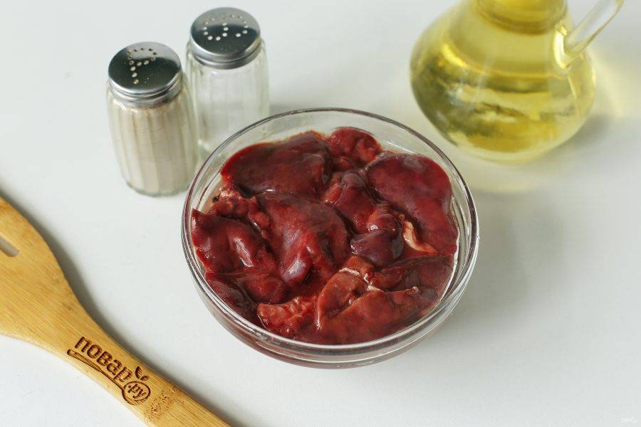 Печень промойте, нарежьте порционными кусочками, добавьте 1 ст.л. растительного масла, соль по вкусу, молотый перец и все перемешайте.