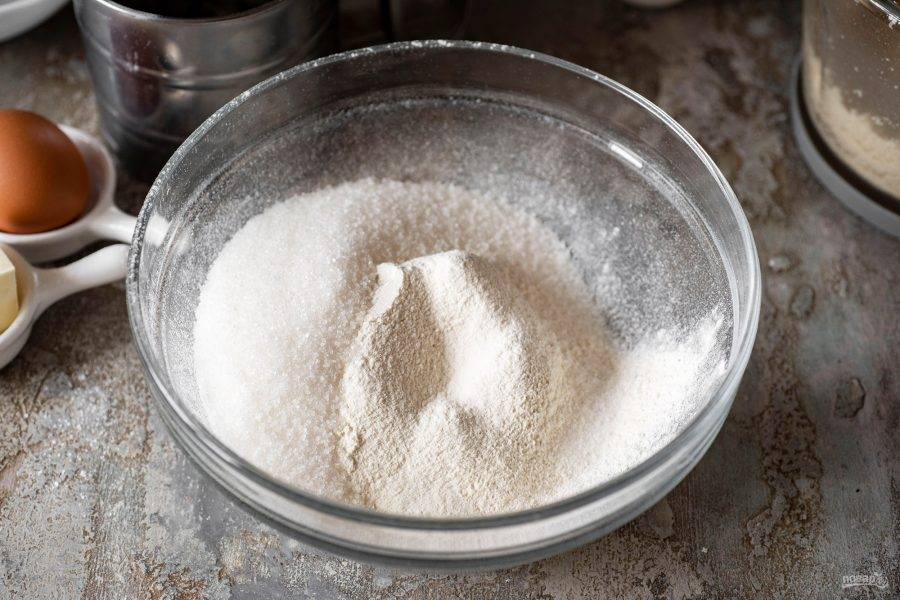 В просторную миску просейте муку, добавьте соль, сахар. Перемешайте все ложкой.