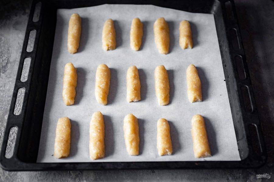 Из теста сформируйте заготовки печенья в виде палочек и выложите на противень, застеленный пергаментом для выпекания. Печенье выпекайте 15-20 минут в уже разогретой до 180 градусов духовке.