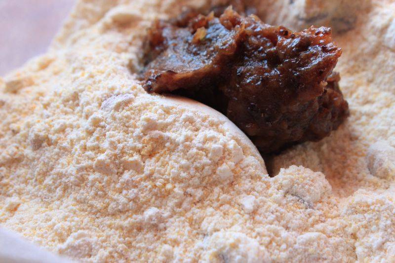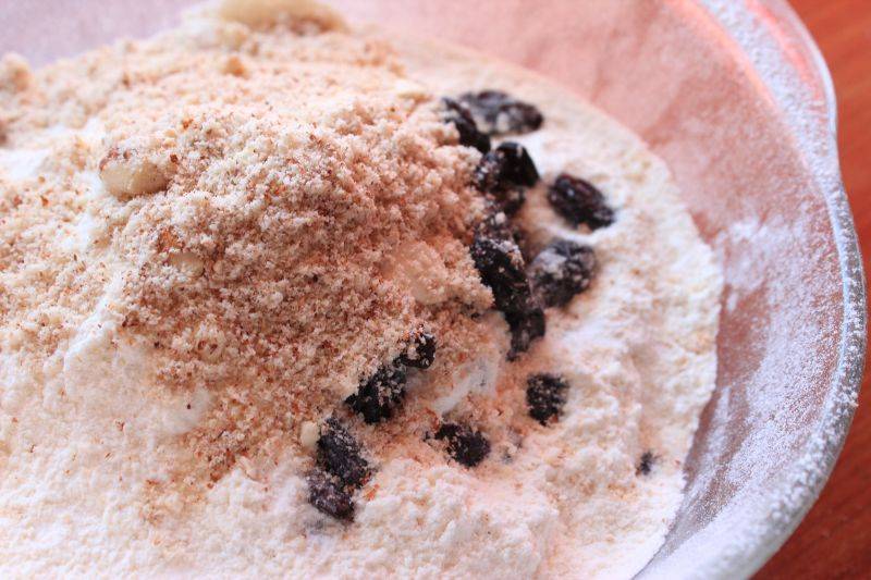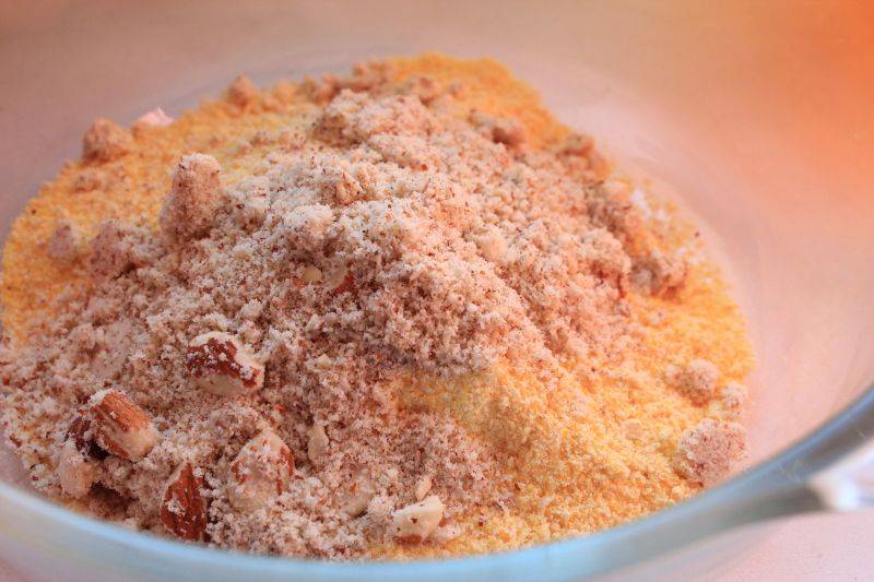 1. Пшеничную муку и кукурузную нужно просеять и выложить в глубокую мисочку. Орехи измельчить немного, но не в пудру, чтобы ощущались кусочки. При желании предварительно их можно подсушить на сковороде.
