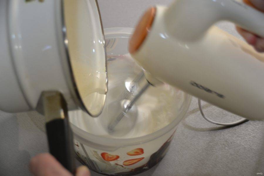 Готовый сироп тонкой струйкой влейте к белкам, не прекращая взбивать.
