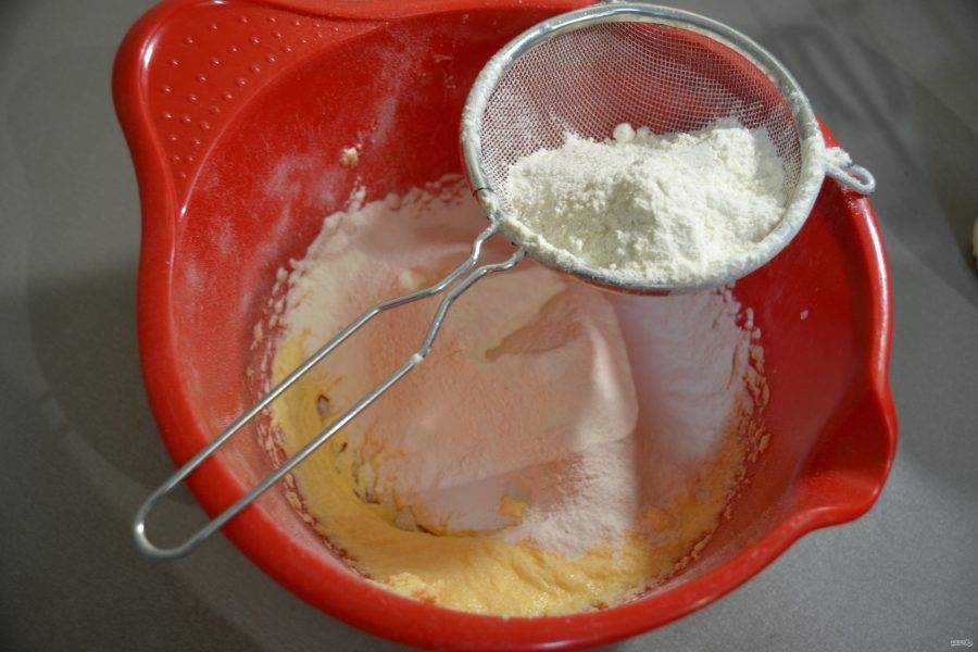 Всыпьте в муку разрыхлитель для теста и 1/3 чайной ложки соли.
