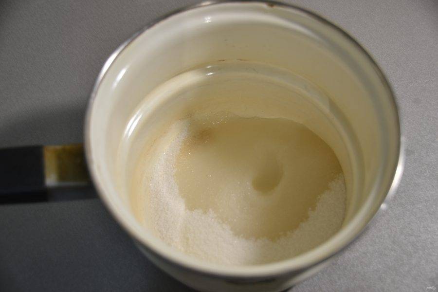 Влейте в ковш 70 миллилитров воды, всыпьте 120 граммов сахарного песка и нагрейте до кипения, после чего варите в течение 5 минут с момента закипания, непрерывно помешивая, чтобы сироп не пригорел.