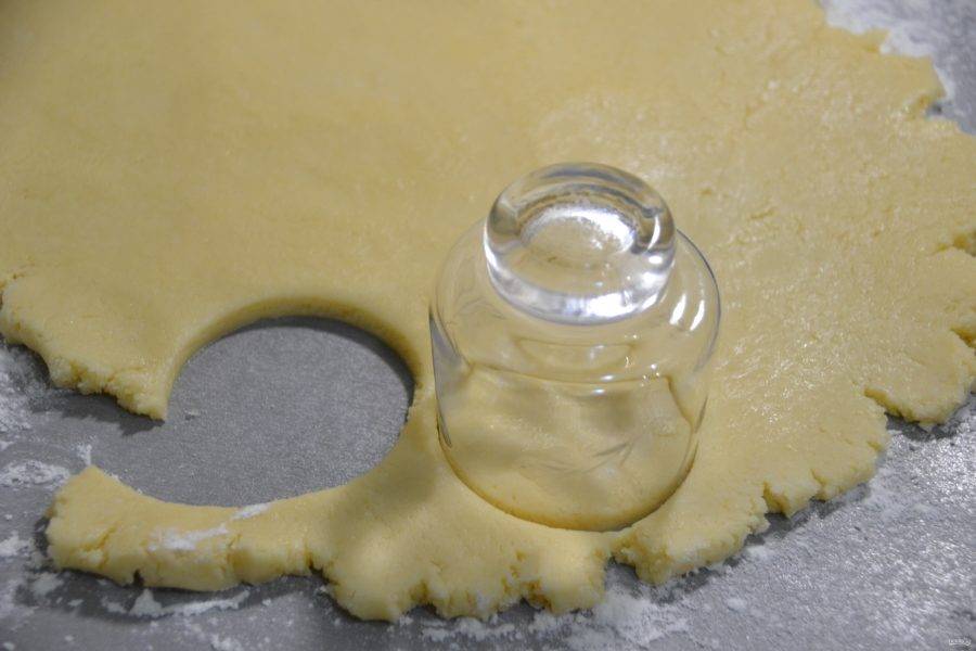 Раскатайте тесто в пласт толщиной 0,5-0,6 см и вырежьте кружочки диаметром примерно 6 см.