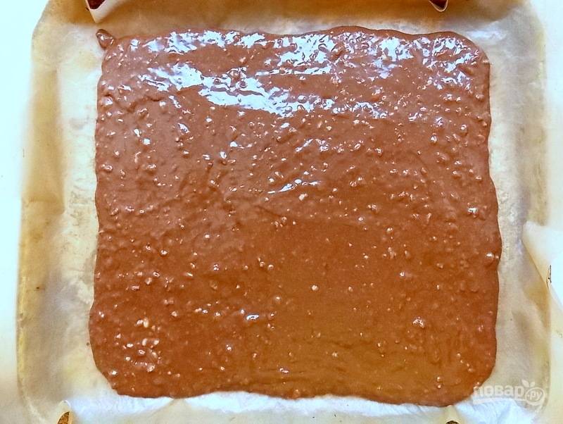 Застелите форму бумагой для выпечки, смажьте маслом. Выложите тесто и разровняйте.