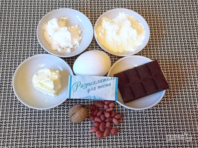 Добавьте муку, разрыхлитель и орехи, перемешайте.