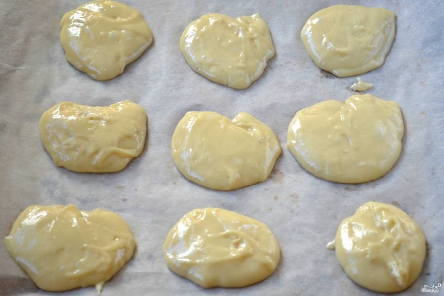 Ложкой выложите бисквитное тесто на пергамент, сформируйте печенье небольшого размера. Выпекайте печенье в разогертой до 180 градусов духовке 20 минут.