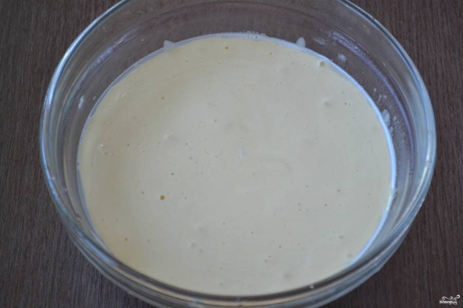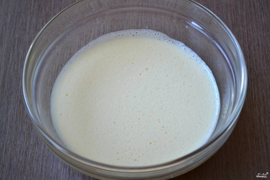 Яйца взбейте с сахаром, пока масса не посветлеет и не увеличится в обьеме.