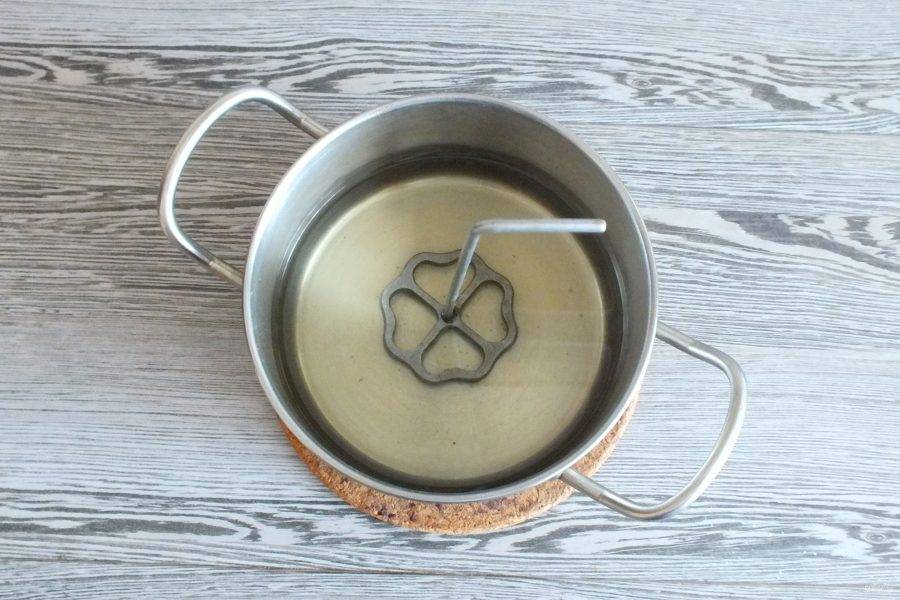 В кастрюле разогрейте растительное масло, после убавьте огонь до чуть ниже среднего. Масло не должно быть перекаленным. Опустите специальную форму в разогретое масло на 10-15 секунд. Она за это время хорошо прогреется.