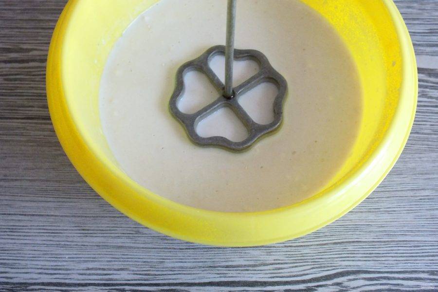 Перемешайте венчиком. Тесто должно получиться жидким, почти как блинное.