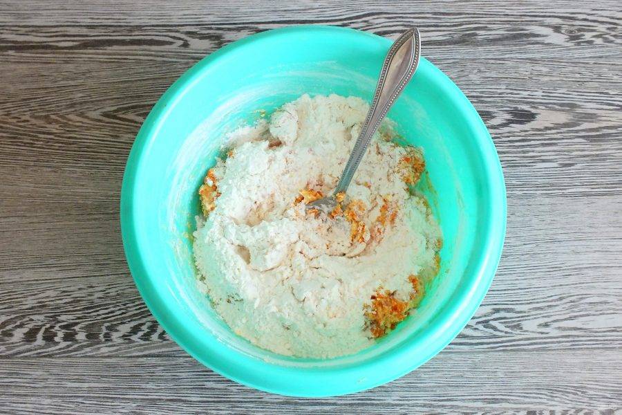 Начните замес ложкой. Как только тесто начнет собираться в комочки, месите руками. Тесто при замесе очень липкое, поэтому понемногу подсыпайте муку.