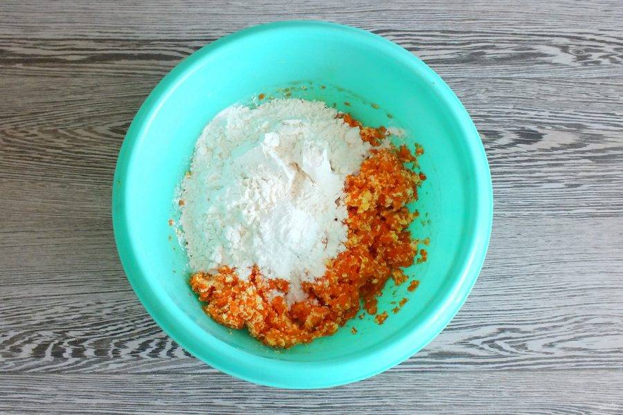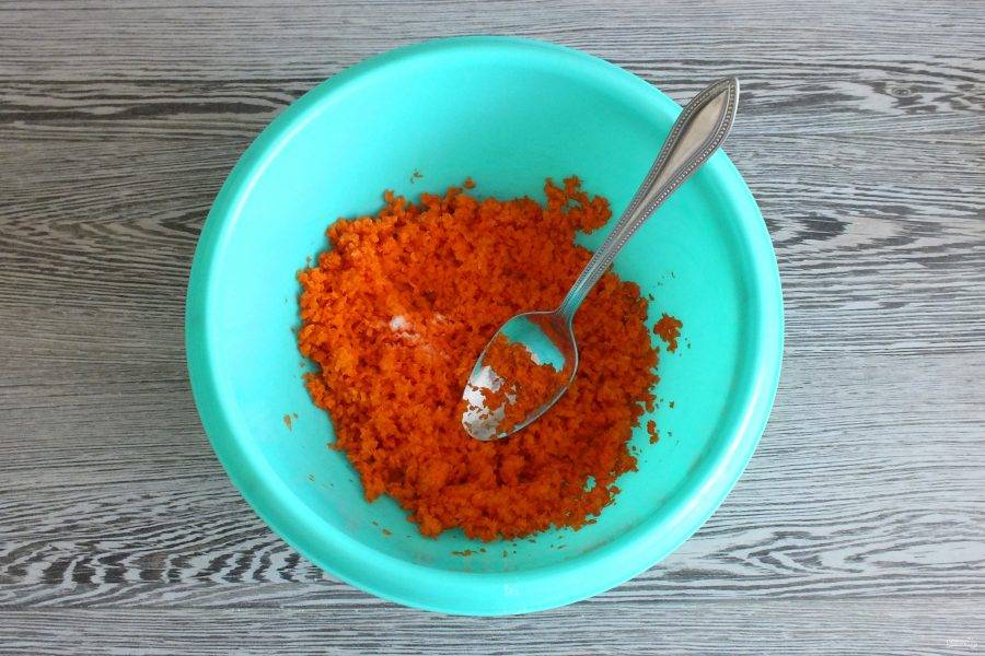 Выложите морковный жмых в чашу. Добавьте апельсиновый сок и перемешайте.