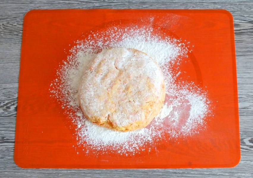 Готовое тесто округлите и переложите на стол, обильно присыпанный мукой.