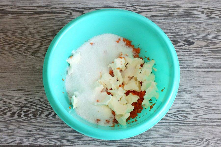 Добавьте мягкое сливочное масло, сахар. Перемешайте.