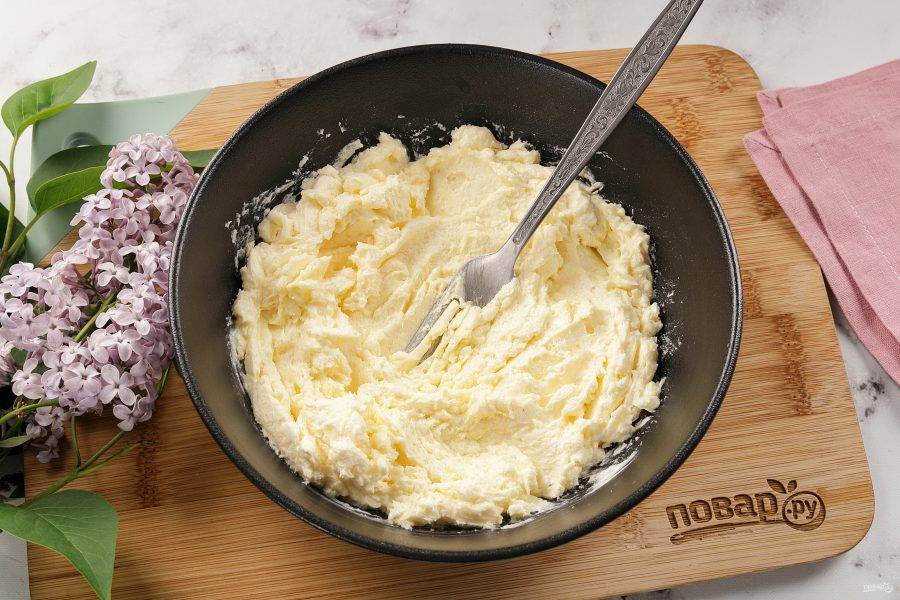 Мягкое масло соедините с сахарной пудрой и перетрите вилкой до однородной массы.