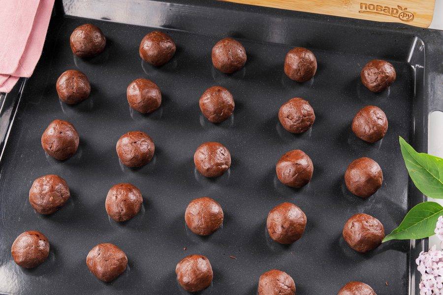 Слепите из теста шарики, размером с грецкий орех и выложите их на противень, оставляя между шариками большое расстояние.
