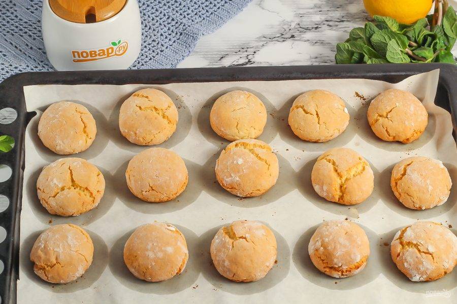 Разогрейте духовку до 180 градусов. Разделите охлажденное тесто на равные части и скатайте его в колобки. Каждый колобок обмакните в сахарную пудру и выложите на пергаментную бумагу, на противень.