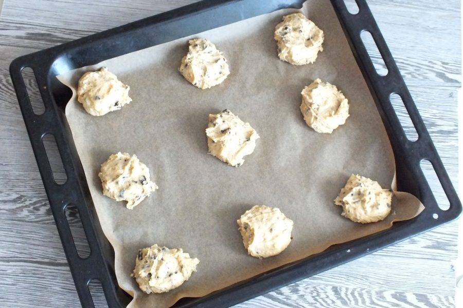 Противень застелите бумагой для выпечки. Выложите столовой ложкой на расстоянии друг от друга тесто. Поставьте в разогретую до 180 градусов духовку на 15 минут. Учитывайте особенности своей духовки.