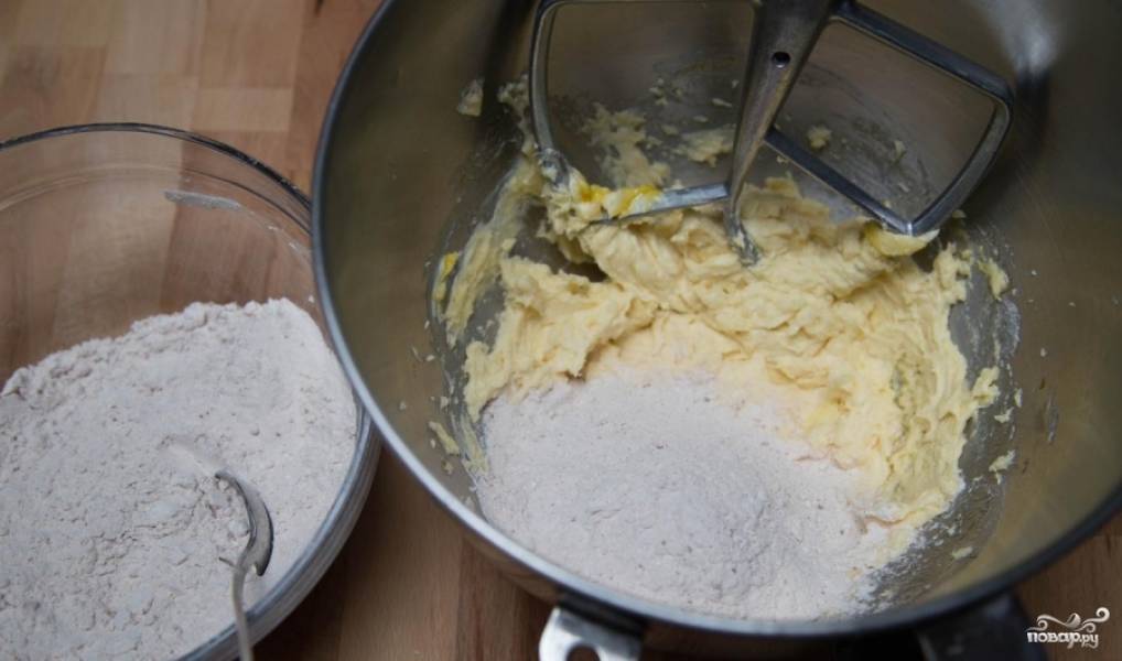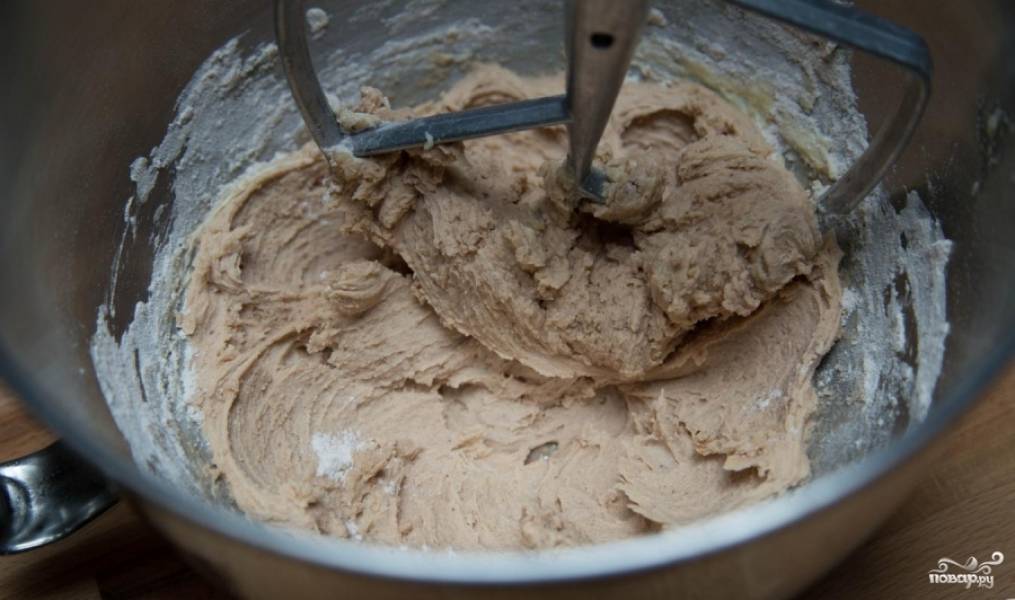 Смешайте муку с порошком какао. И постепенно добавляйте в полученную массу, постоянно помешивая.