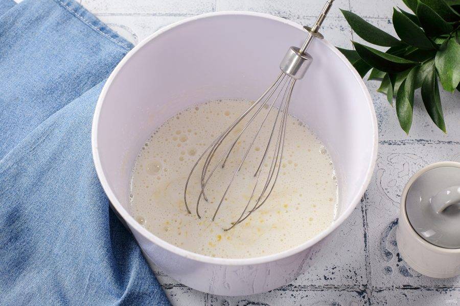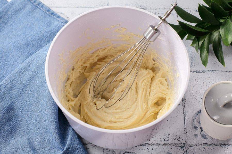 Яйцо взбейте с сахаром до состояния пены. Лучше всего воспользоваться блендером или миксером. Затем влейте растопленное сливочное масло.