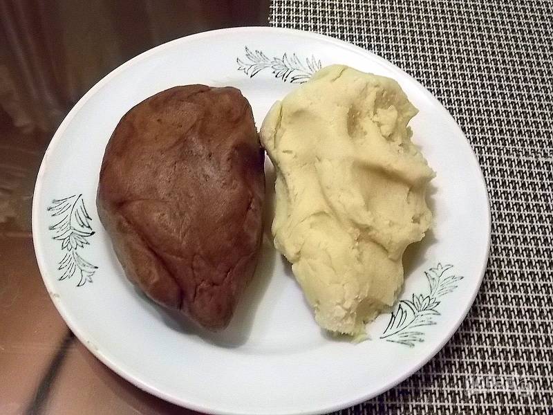 Разделите тесто на две части. Добавьте в одну часть какао и перемешивайте до однородного цвета.
