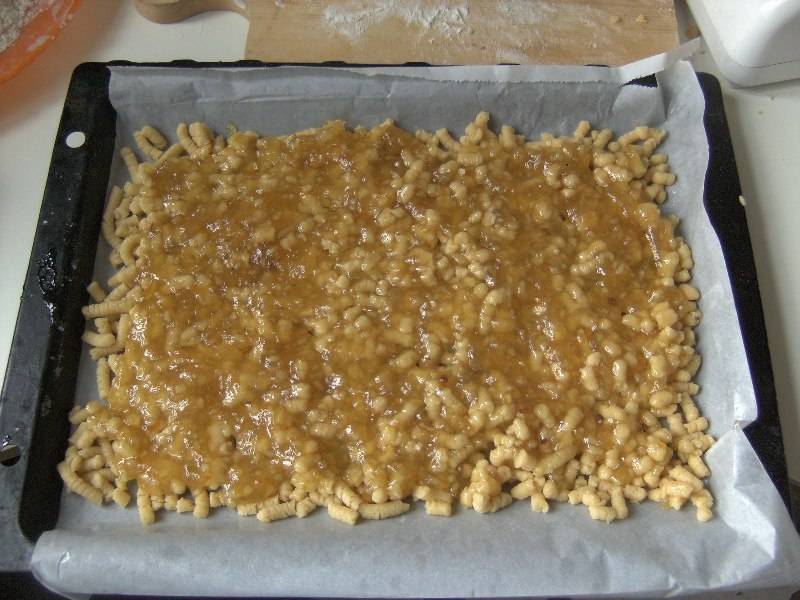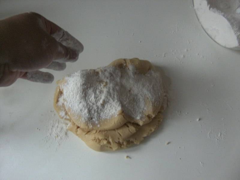 По истечении времени достаем тесто и начинаем перекручивать его через мясорубку. Червячки из теста должны падать на поверхность, посыпанную мукой.