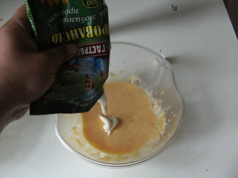 Добавляем к смеси желтков и сахара майонез и ванилин, перемешиваем.