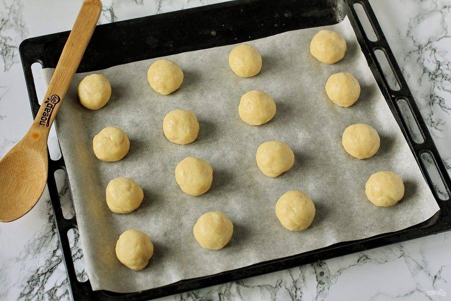 Отщипывайте от готового теста кусочки и формируйте руками шарики, размером примерно с грецкий орех. Переложите заготовки на противень, застеленный пергаментом. Выпекайте в духовке при температуре 180-200 градусов около 20 минут.
