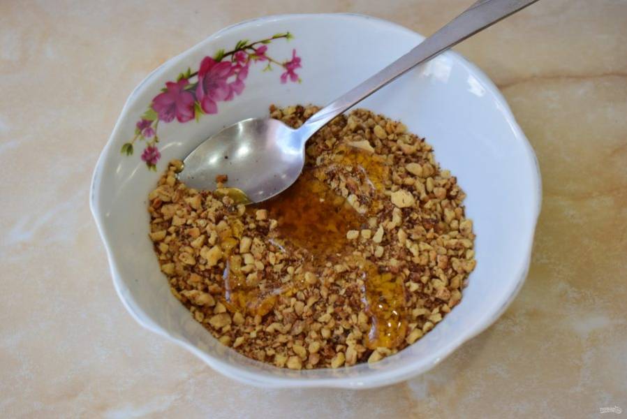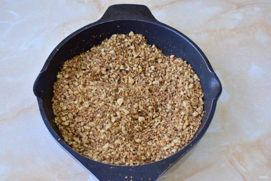 Для начинки измельчите грецкие орехи и обжарьте их на сухой сковороде до появления характерного аромата. Затем пересыпьте орехи на тарелку и остудите.