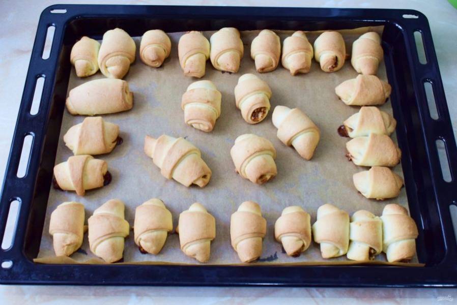 Тесто разделите на 2-3 части. Каждую часть раскатайте в круг и нарежьте на сегменты. Выложите на широкую часть ореховую начинку и скрутите в рулет.