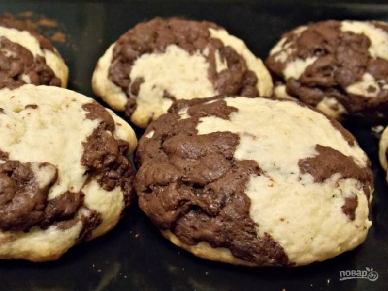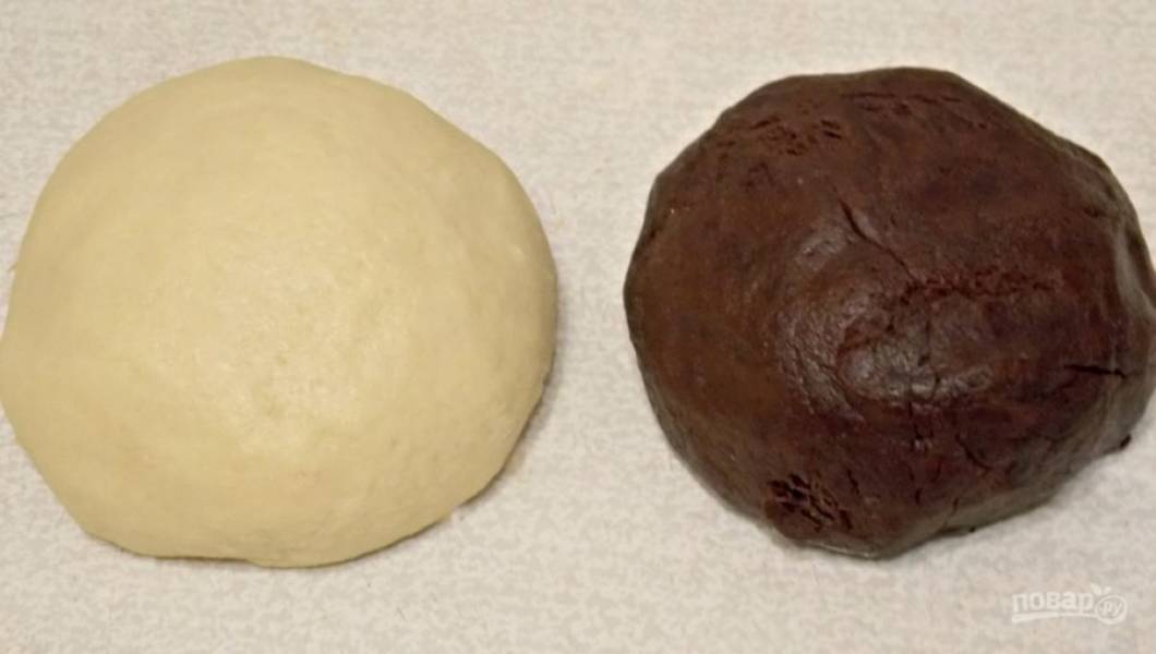 Перемешайте муку, сахар, соду, разрыхлитель и ванилин. Натрите масло на крупной терке, перемешайте с мучной массой до крошке. Добавьте сметану, яйца и замесите тесто. Разделите тесто на две равные части. Добавьте в одну какао и снова замесите до однородного цвета. Уберите в полиэтиленовый пакет, положите в морозильную камеру на 1 час.