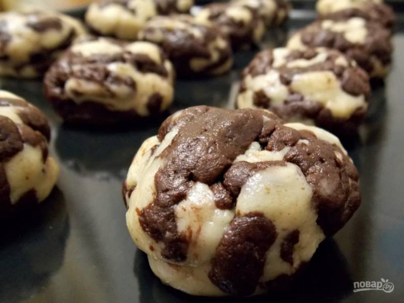 Сформируйте шарики величиной с крупный орех. Положите на противень и немного прижмите.