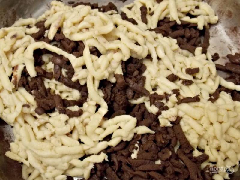Натрите тесто на крупной терке в разные чаши.