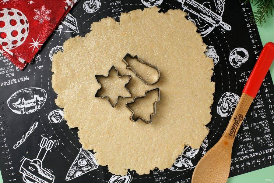 Готовое тесто раскатайте в пласт, толщиной около 0,5 см. При помощи формочек выдавите любые фигурки.