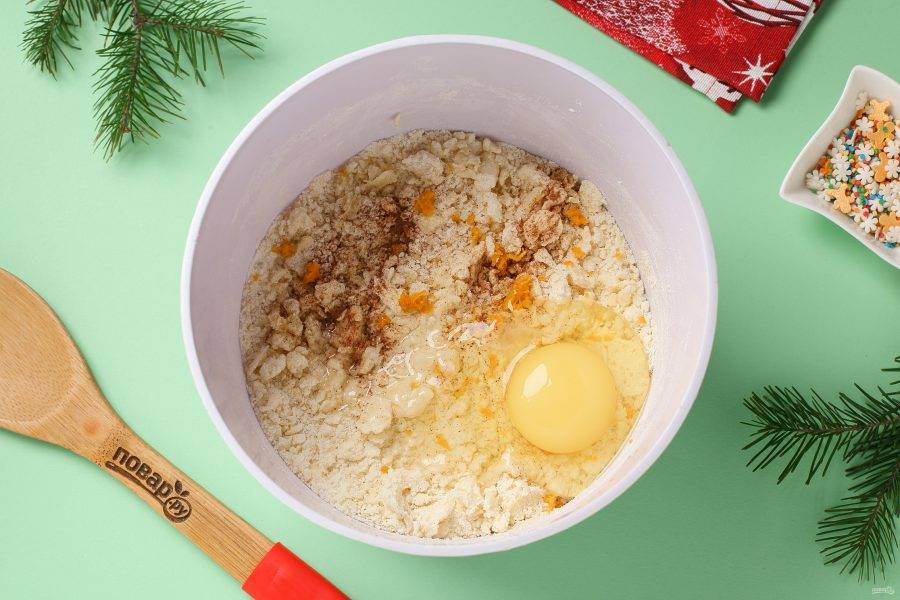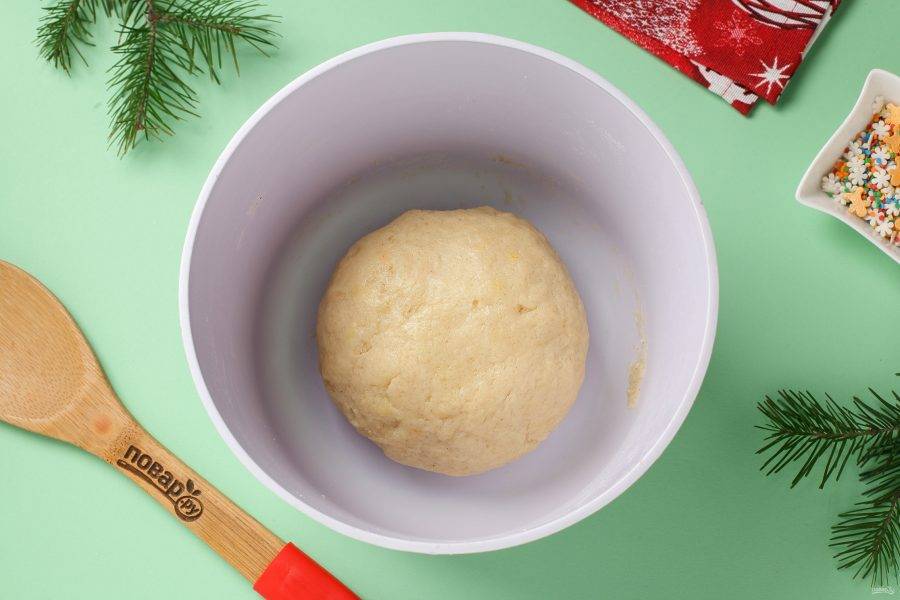 Перемешайте всё ложкой, а затем руками замесите мягкое тесто. Соберите его в шар, заверните в пищевую плёнку и уберите в холодильник на 1 час.