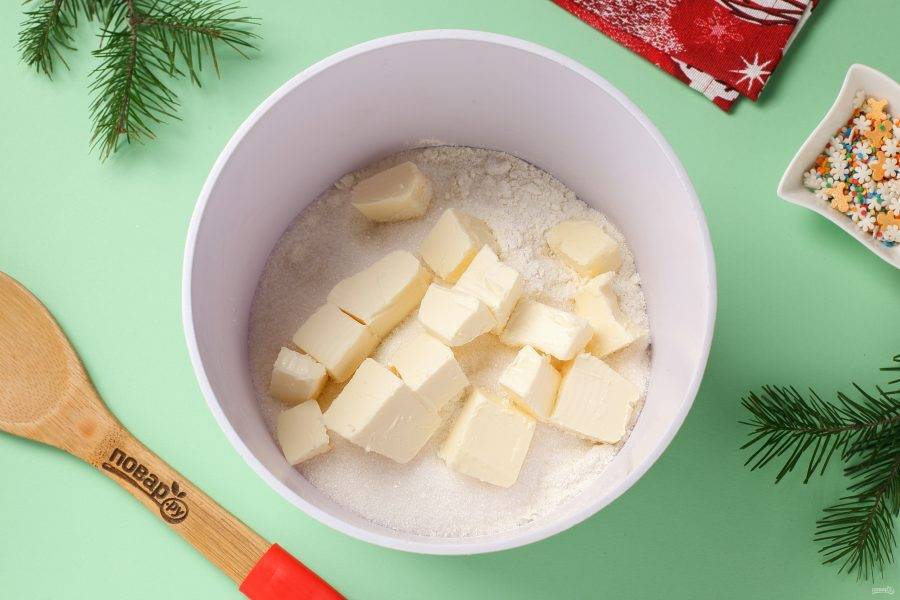 В глубокой миске соедините муку и сахар. Добавьте размягчённое сливочное масло.