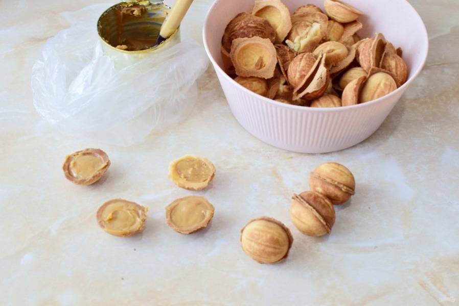 Наполните песочные скорлупки вареной сгущенкой и соедините их в орешки.