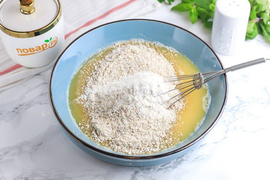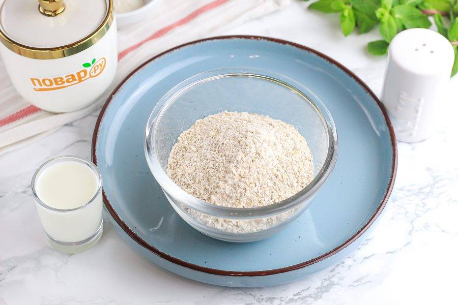 Перемолите овсяные хлопья в крошку, необязательно в муку. Если у вас нет измельчителя, то просто приобретите вместо хлопьев овсяную муку.