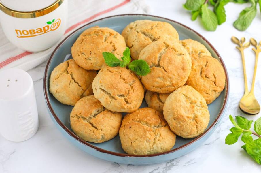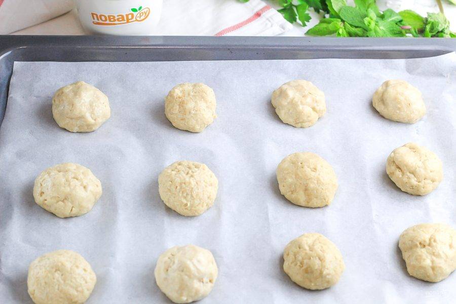 Застелите противень пергаментной бумагой и скатайте из частей теста небольшие колобочки. Выложите их на равном расстоянии друг от друга. Разогрейте духовку до 180 градусов и поместите в нее противень на средний ярус.