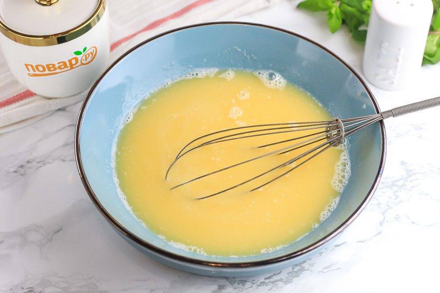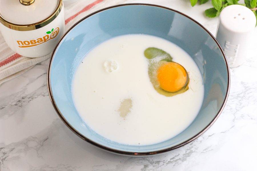 Молоко влейте в глубокую емкость, вбейте туда же куриное яйцо. Всыпьте соль и сахар, взбейте все. По желанию можно добавить ванильный сахар или другой ароматизатор.