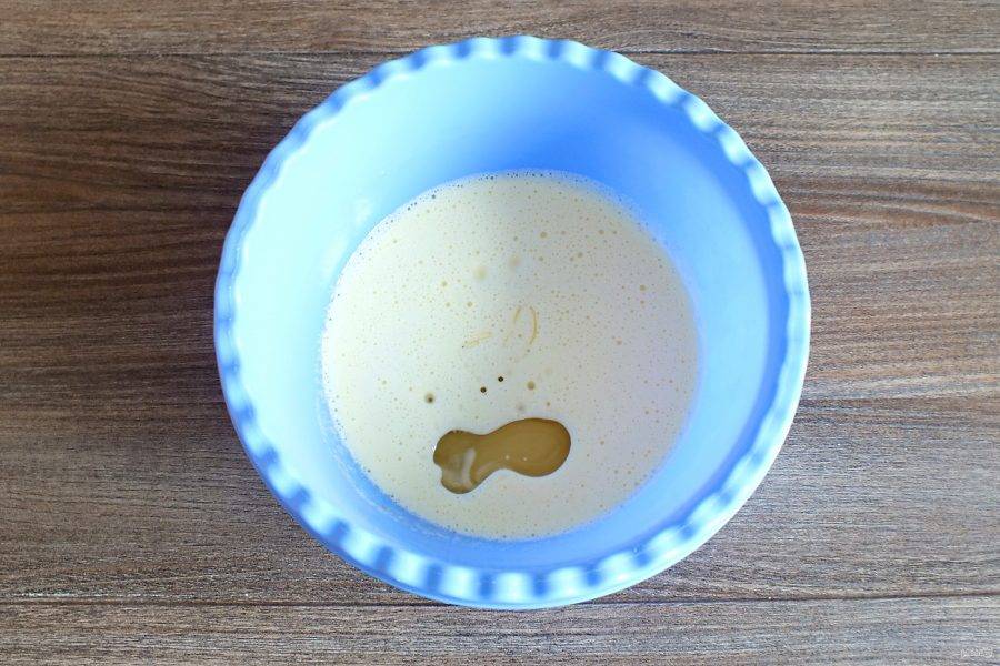 Добавьте мёд, растительное масло. Взбейте еще раз.