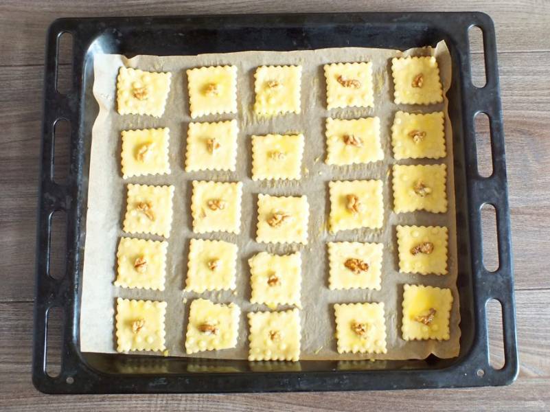 Противень застелите бумагой для выпечки. Переложите на него печенье. Смажьте его яйцом. На серединку выложите, слегка вдавив, половинку орешка. Поставьте выпекаться в разогретую до 170 градусов духовку на 8-10 минут.