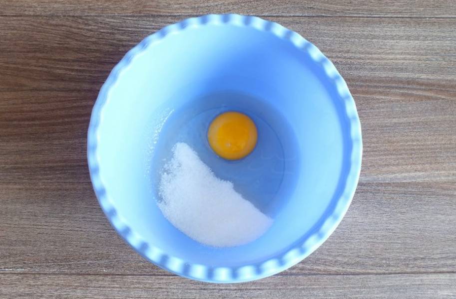 В чаше соедините 1 яйцо и сахар. Взбейте миксером в пышную, белую массу.