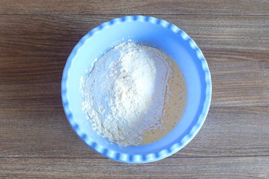 Всыпьте муку, разрыхлитель для теста. Замесите мягкое, податливое тесто. К рукам оно липнуть не должно.