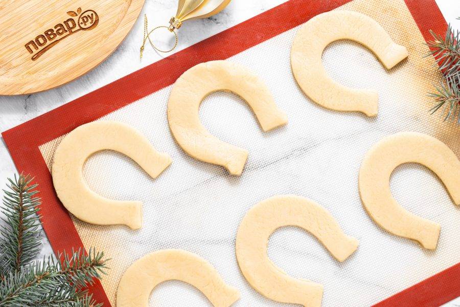 Раскатайте тесто в пласт на слегка присыпанной мукой поверхности до 5-6 мм. Вырежьте печенье с помощью формочки в виде подковы. Выложите печенье на коврик для выпечки на небольшом расстоянии друг от друга. Выпекайте 10-12 минут в хорошо разогретой до 180 градусов духовке до золотистого цвета.