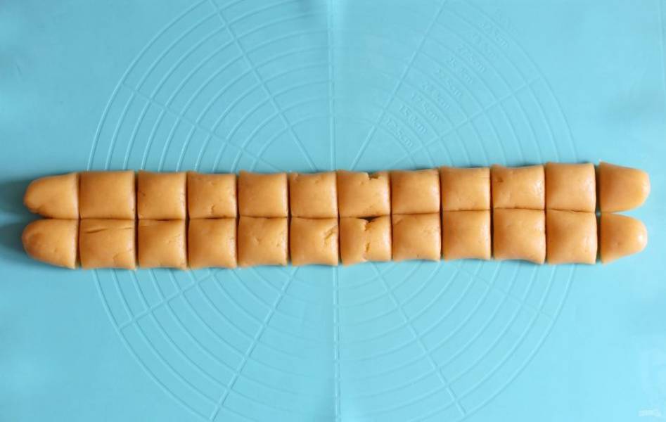 Жгуты выложите друг с другом. Нарежьте на кусочки в пределах 4 см.