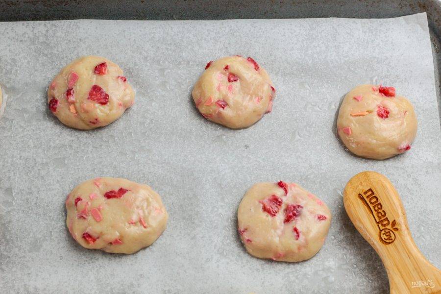 Разделите тесто на части. Застелите противень пергаментной бумагой и скатайте части теста в руках в колобки. Выложите их на пергаментную бумагу. По желанию можно сбрызнуть ее растительным маслом.
