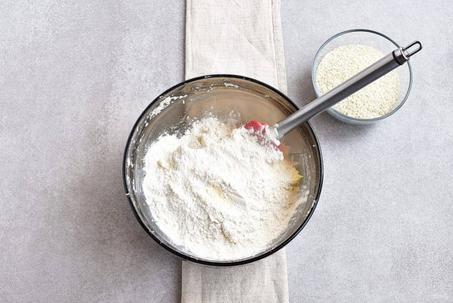 Добавьте кунжут, и быстро лопаткой вымешайте легкое тесто.