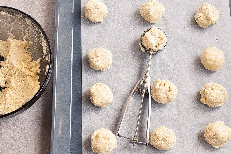 Разложите порции теста на застеленный пергаментом лист для выпечки. Чтобы бумага не скользила, слегка сбрызните лист водой. А раскладывать будущее печенье удобно с помощью ложки для мороженого. Оставьте расстояние между шариками теста.