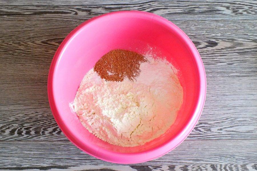 В чаше смешайте сухие ингредиенты: муку пшеничную, отруби, разрыхлитель для теста, соль.